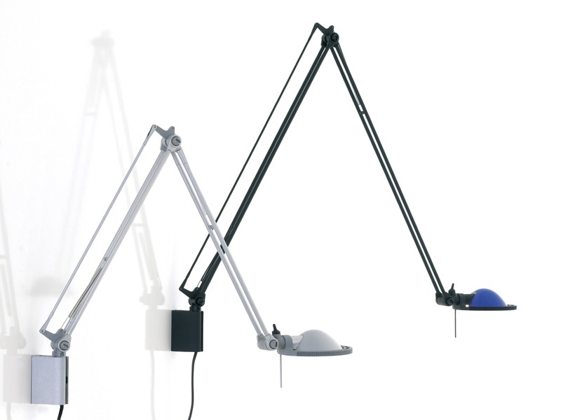 It is the inimitable founding product of a new type range of reasonably small sprung-jointed lamps. Berenice operates with a transformer that allows low tension current to reach the bulb through the rods without electrical cable, thus leaving its figure slender and elegant. Thanks to a special distancer fitted into the lower part of the head, the light can be brought very close to whatever needs to be illuminated, while maintaining the right distance from objects. A simple touch of the head ring, which is well insulated and independent from the bulb housing, will also orient the light in any direction.