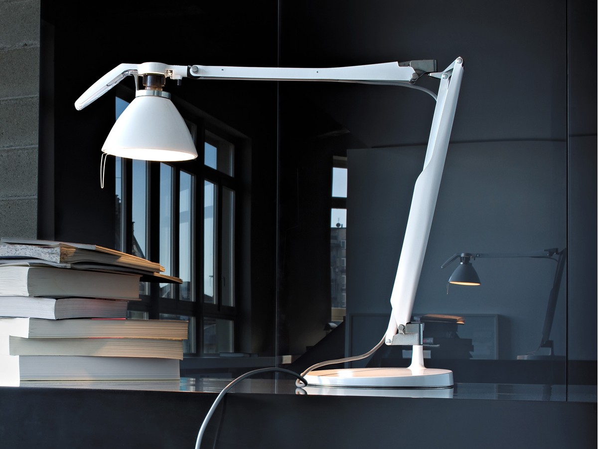 The lamp’s distinctive handle – which includes a dimmer or normal switch - is designed in such a way as to be easily held and manoeuvred. The Fortebraccio is available with a universal mount, allowing it to be fitted directly on tables, walls and, thanks to its particular system of joints, on slanted surfaces.