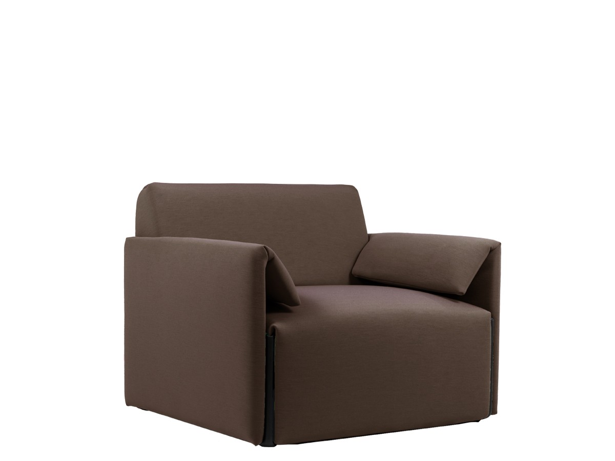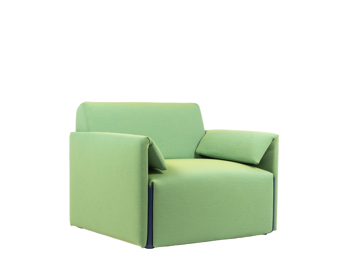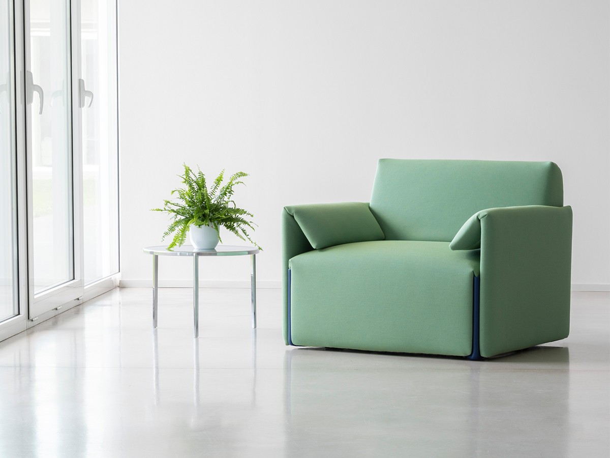 Hidden under the generous fabric upholstery, the Magis Costume Armchair from Stephen Diez has an innovative polyethylene structure that has been designed to be recyclable. The Costume collection is completely modular, with elements secured with colourful plastic connectors, allowing you to customise the piece to suit your needs ober time. This configuration has distinctive armrests that are folded over to provide an extra level of comfort and support, a highly comforting addition to a living room or bedroom space.