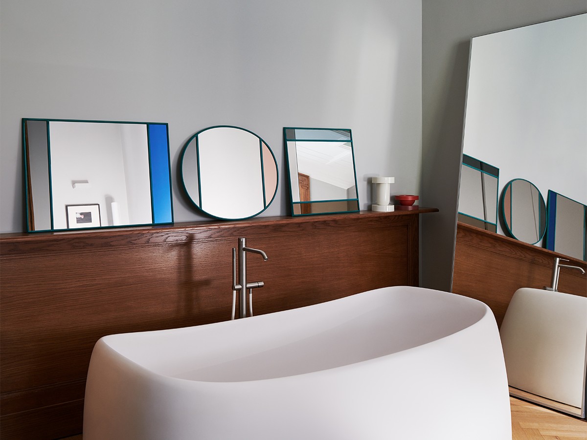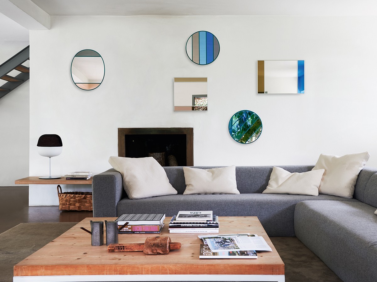 Envisioned as a way to bring light and joy into homes, the Magis Vitrail Wall Mirror uses contrasting sections of tinted glass to create a unique pattern, accented by a unique rubber frame. The geometric nature of the piece allows it to be hung in a variety of ways, making it an incredibly functional design object for the modern home. Several mirrors from the collection can be combined in numerous different ways, adding a new dimension to your living space.