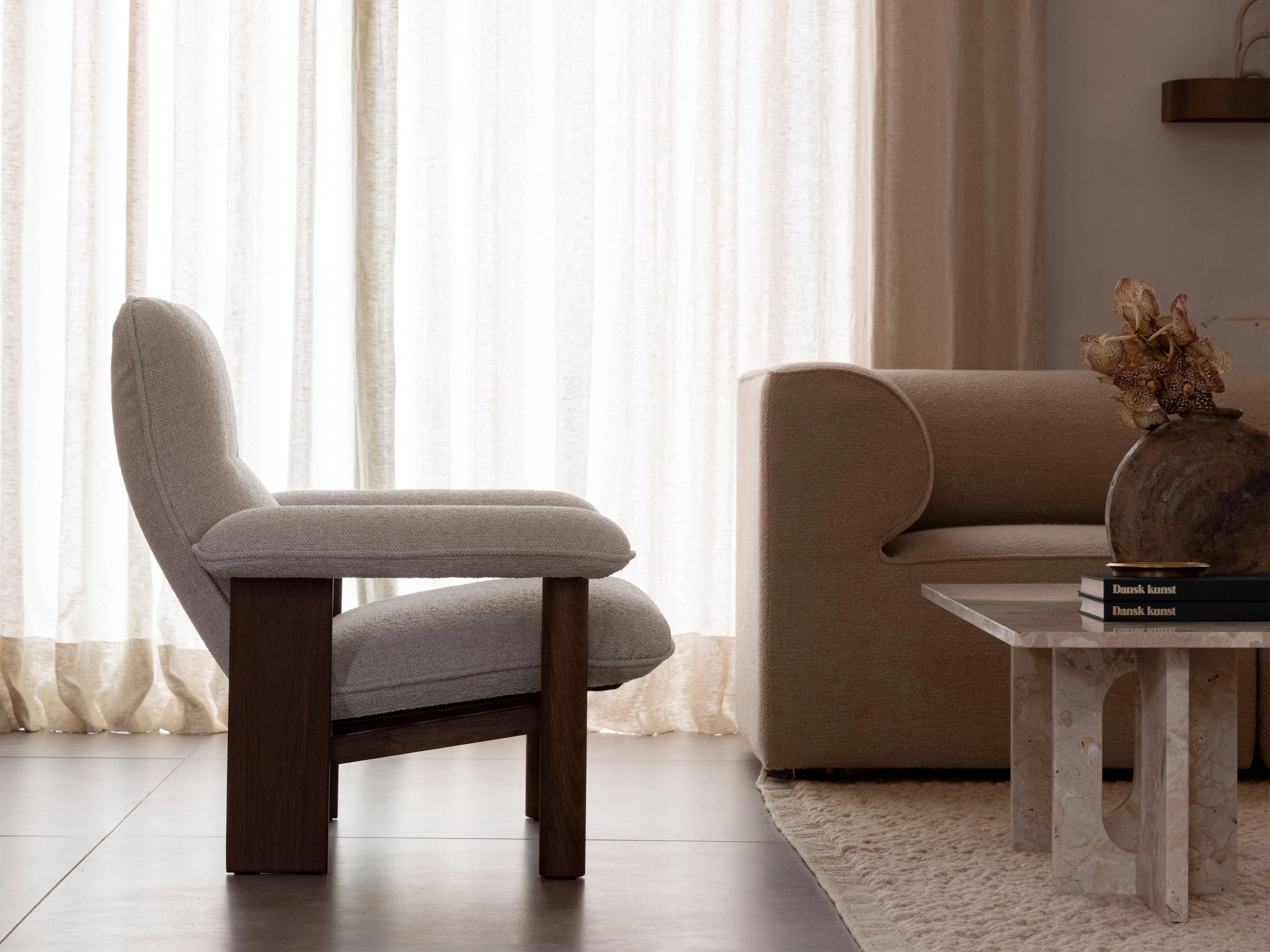 Combining mid-century Danish minimalism with the bold expressiveness of Brazilian Modernism, the Audo Copenhagen Brasilia Lounge Chair & Ottoman adds a sumptuous touch to your space. The lounge chair and footstool have been designed to work in harmony with each other, allowing you to recline in luxurious comfort, or rapidly reconfigure your space to accommodate surprise guests. The generously proportioned armrests are designed to allow perching, giving you a multiplicity of options for sitting or lounging. The sturdy wooden frame gives both pieces a timeless quality.