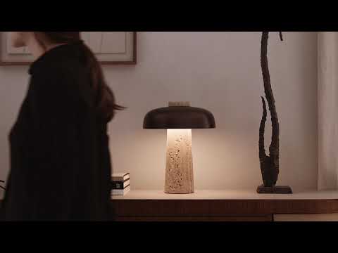 Defined by a sleek domed shade, paired with a stunning conical travertine or Carrara marble base, the different materials work in unison to form a striking, characterful design statement. Perfectly balanced, the textured piece creates a delicate, evenly dispersed light, controlled by a subtle dimmer placed at the top of the shade.