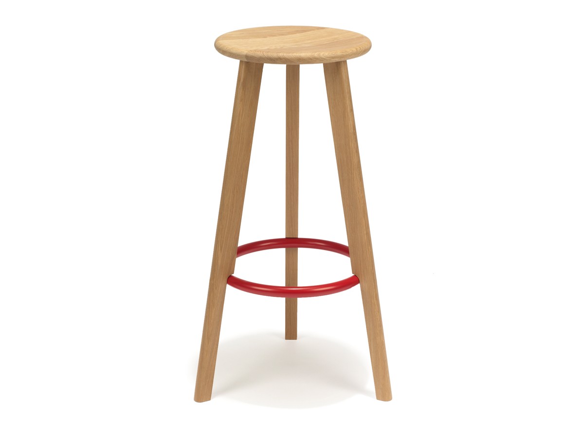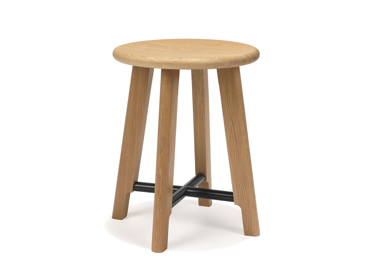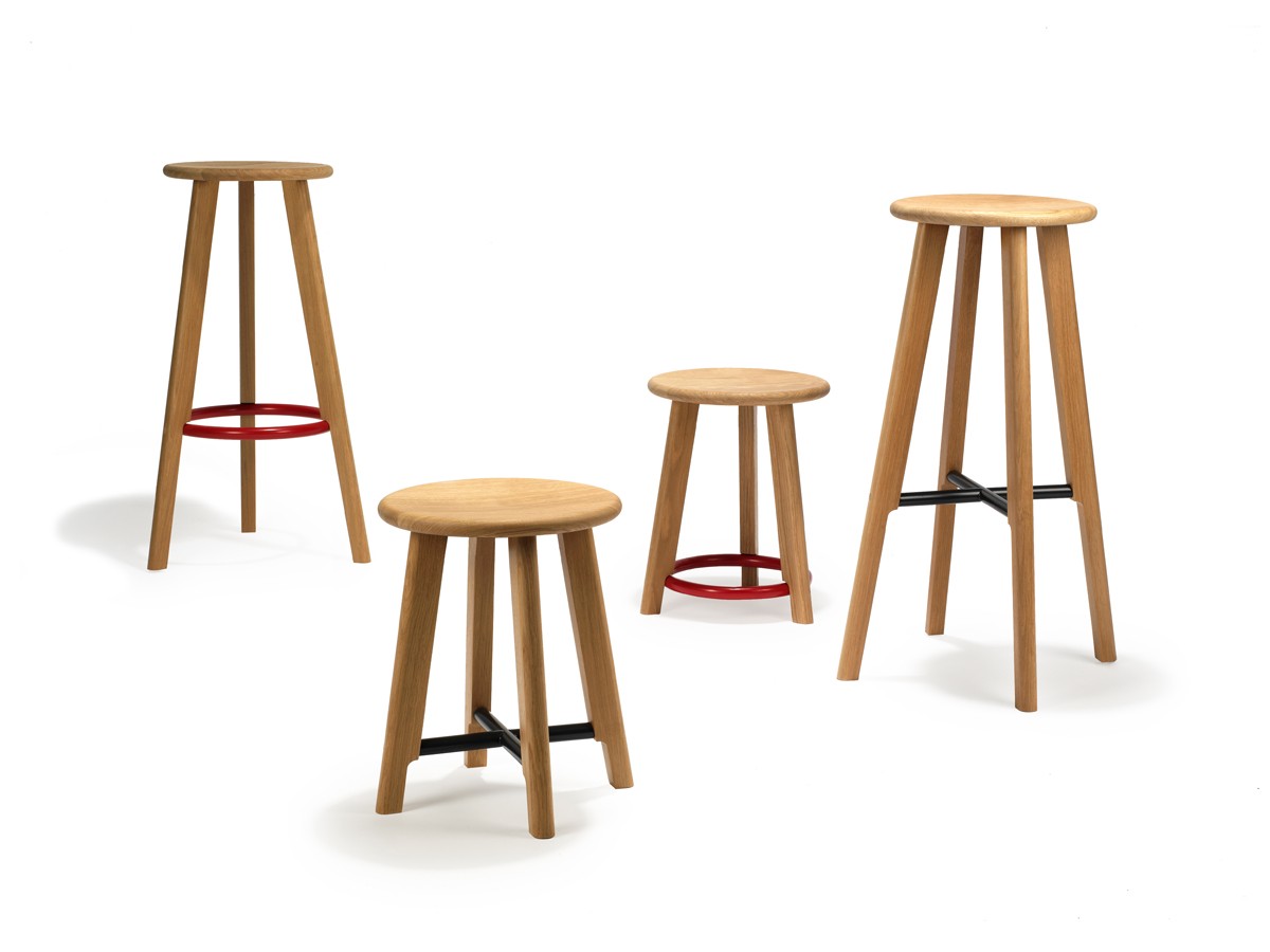 The three/four-legged oak stools have a powder-coated steel 'O' or 'X' at the base which serves as a foot rest.