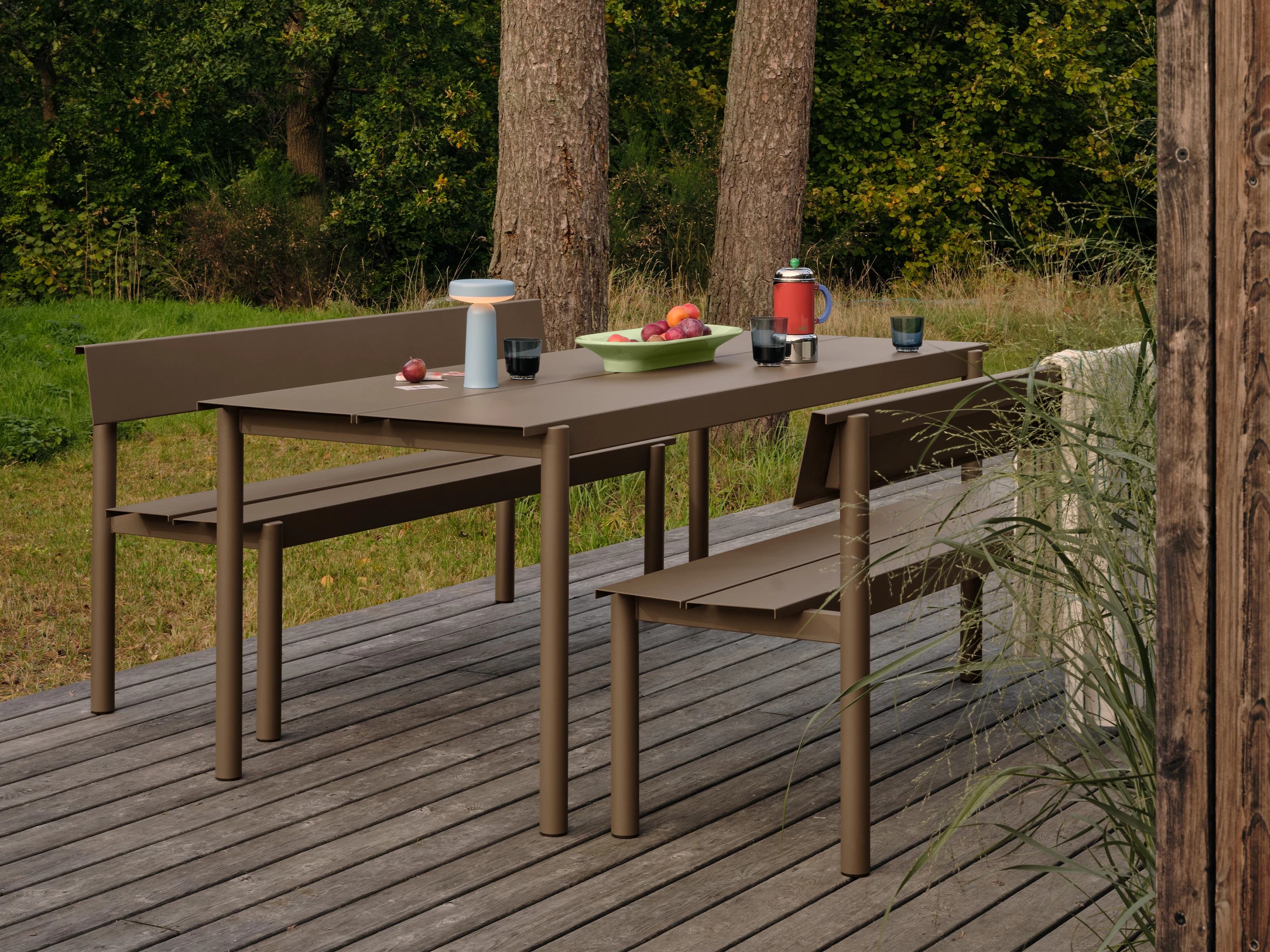 Paired with the Outdoor Linear Steel Bench, it is the perfect table for dining alfresco.