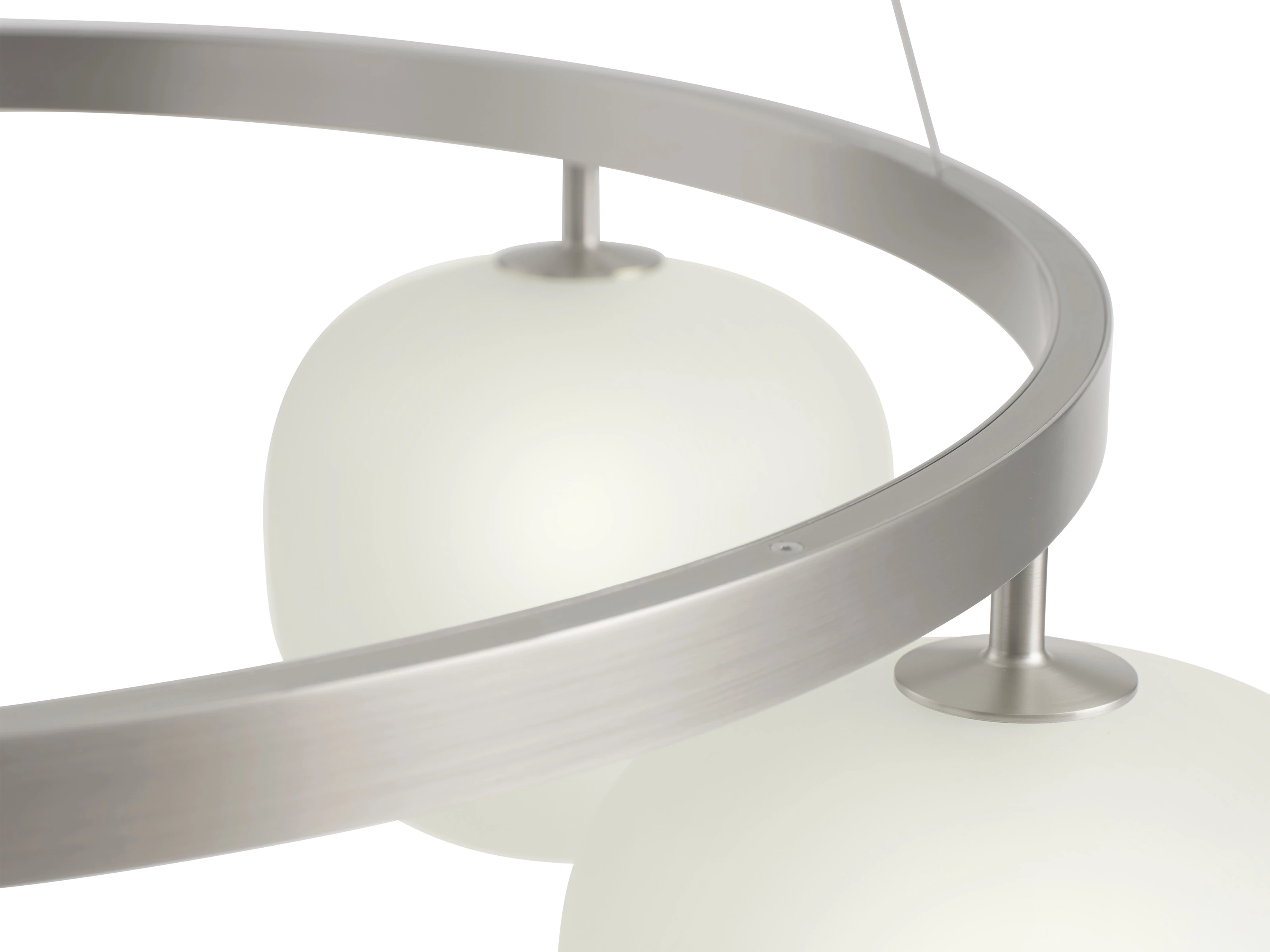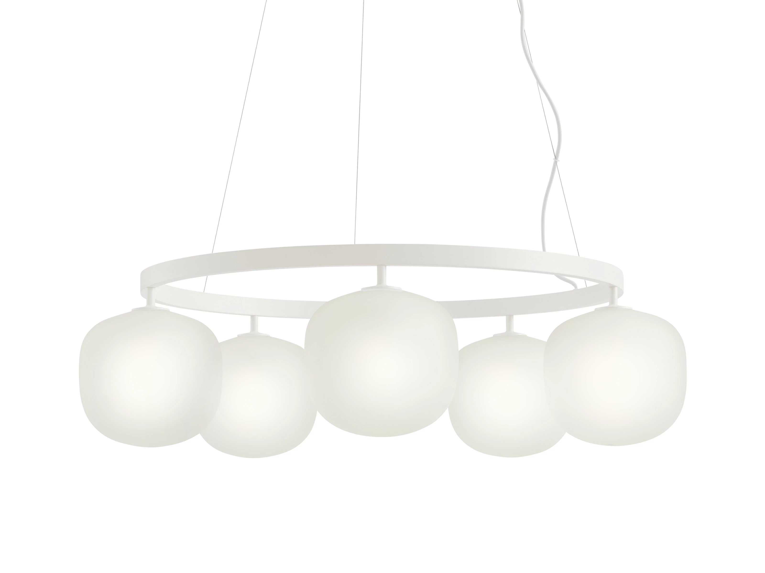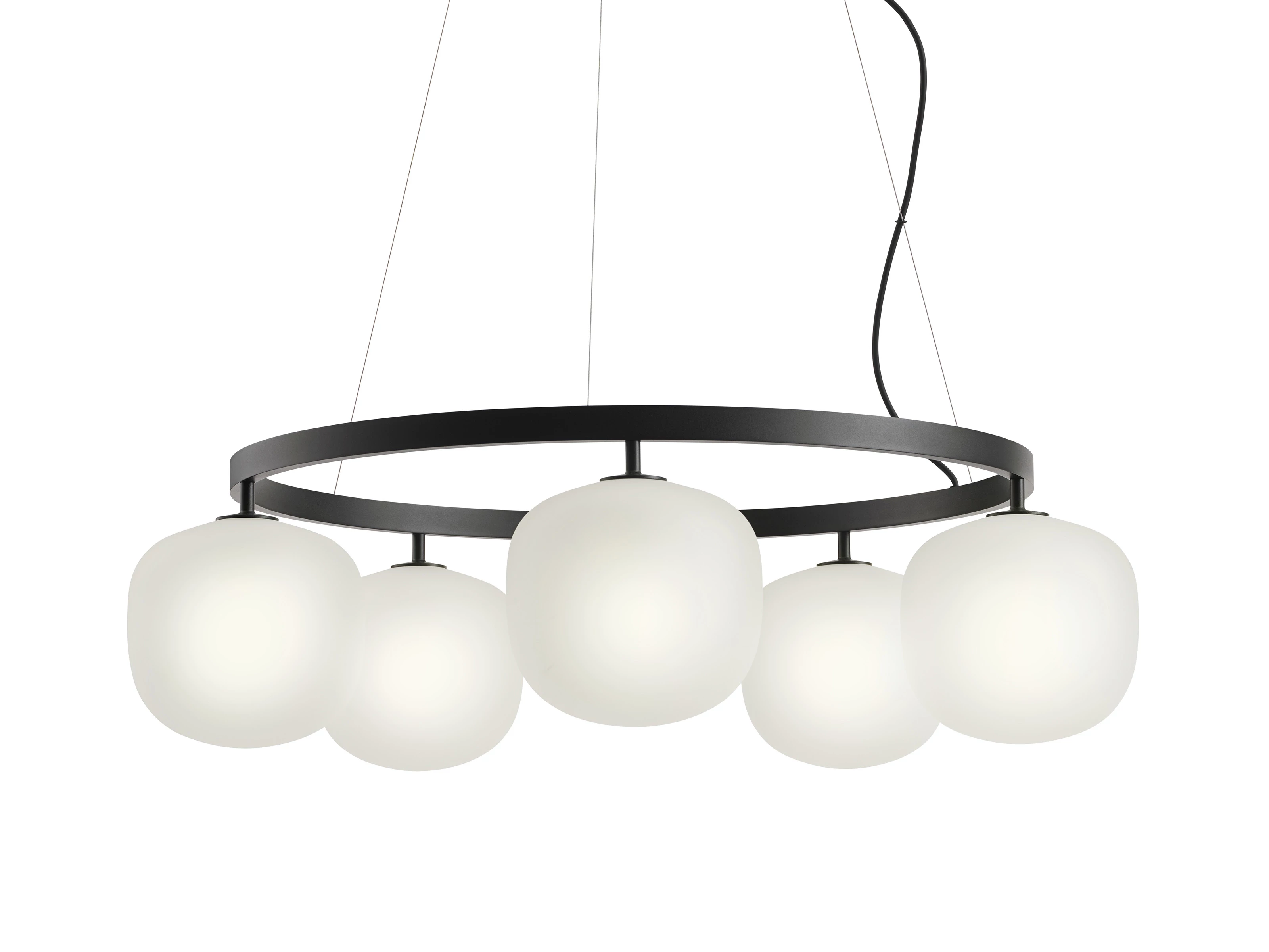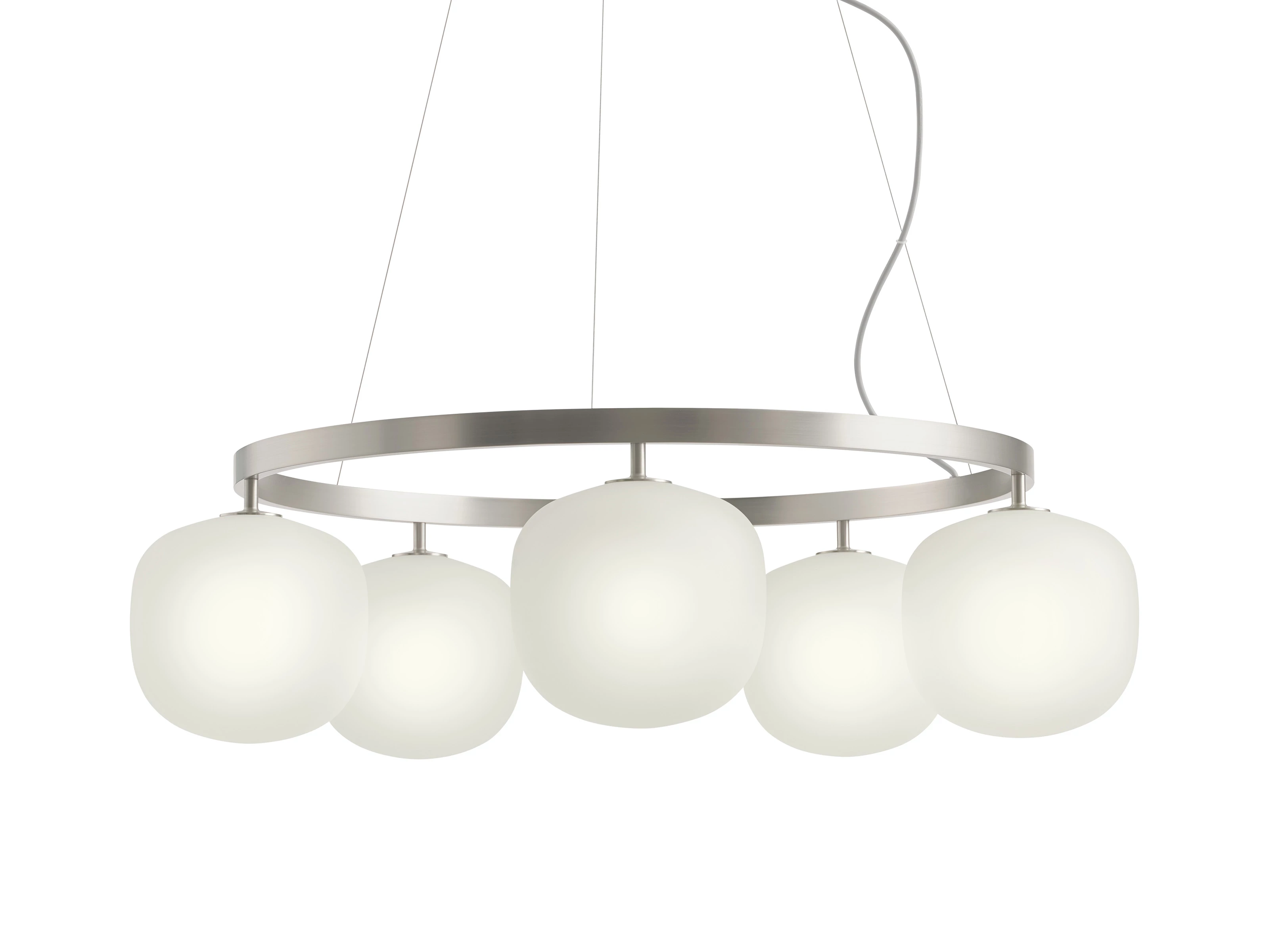 Drawing on the success of the original Rime Pendant Lamp, the Rime Chandelier transforms a familiar form into a contemporary light installation. Five mouth-blown glass shades diffuse a calm, even glow, while a sharply defined aluminium frame introduces a deliberate industrial edge. Exposed fixings and finishes in white, black or aluminium grey reinforce its confident, modern identity.