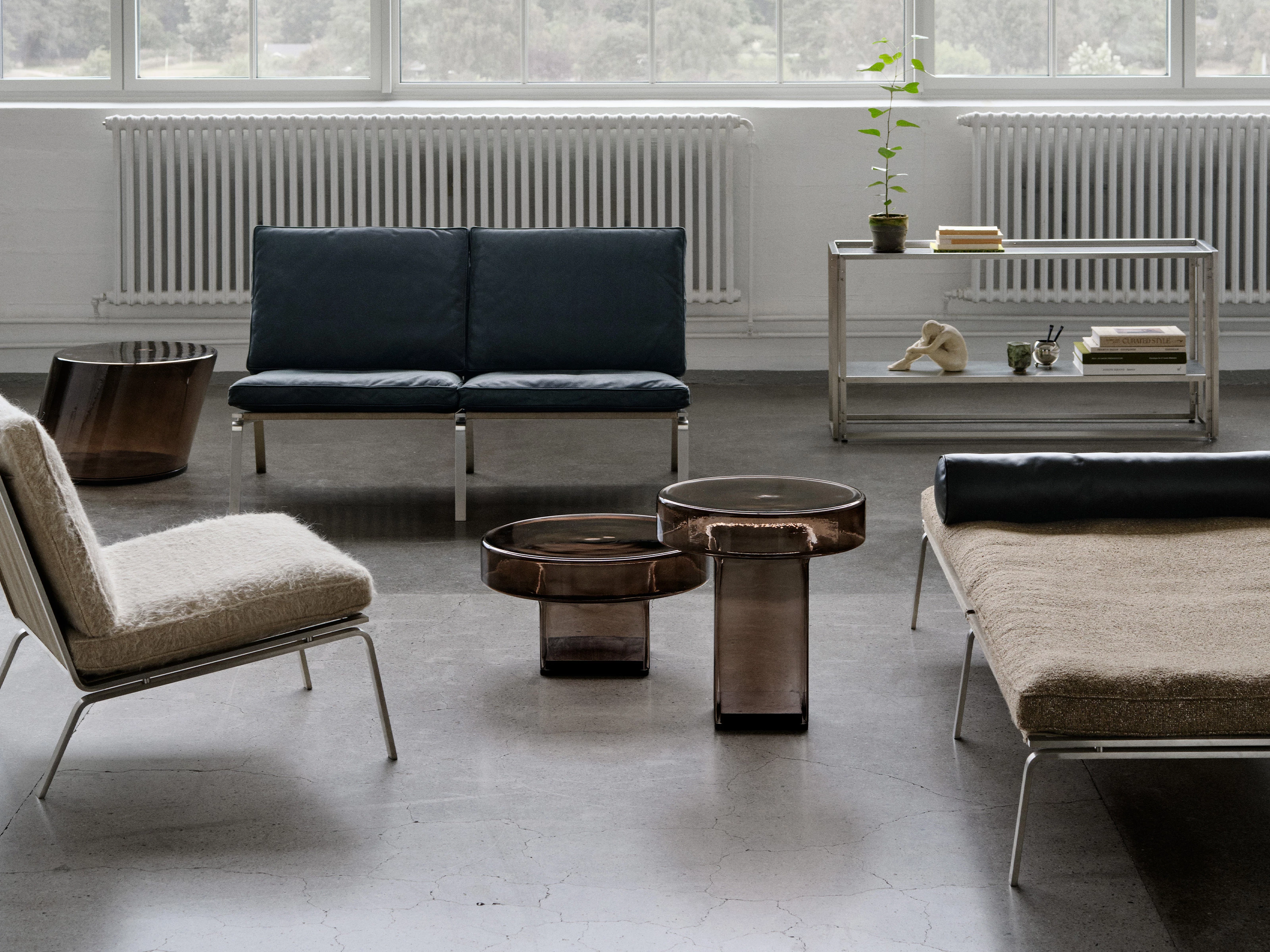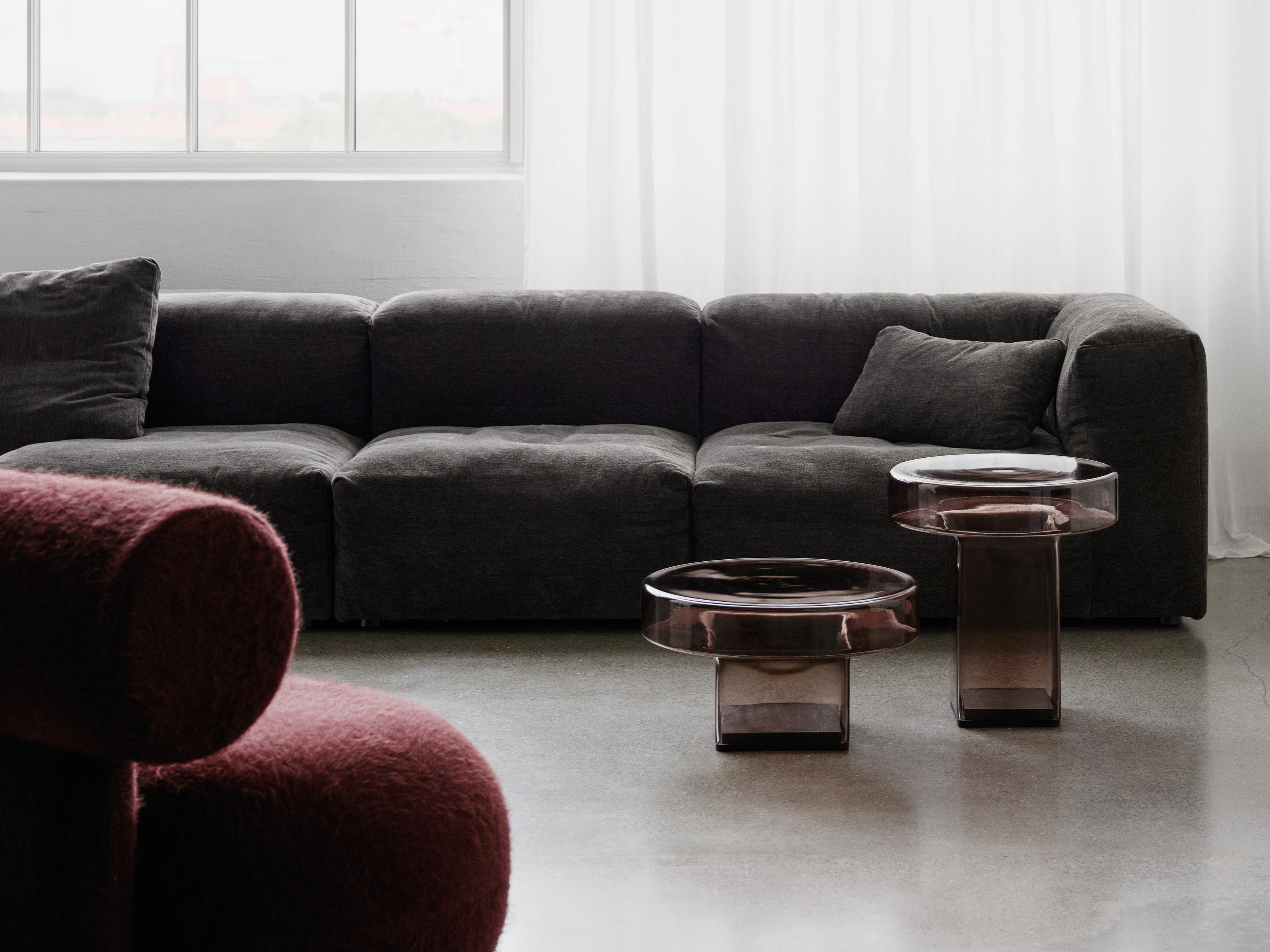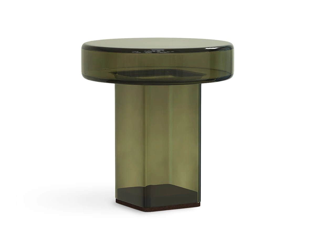 Mouth-blown from a single piece of glass, tempered, and anchored on a dark-smoked oak base, it balances bold geometry with visual lightness. Available in three coloured finishes, the table works alone or alongside other pieces in the Naked series to form your own creative compositions. Whether placed at the centre of a room or by your favourite lounge chair, the design’s see-through silhouette brings clarity, character and a quiet sense of sculptural refinement.