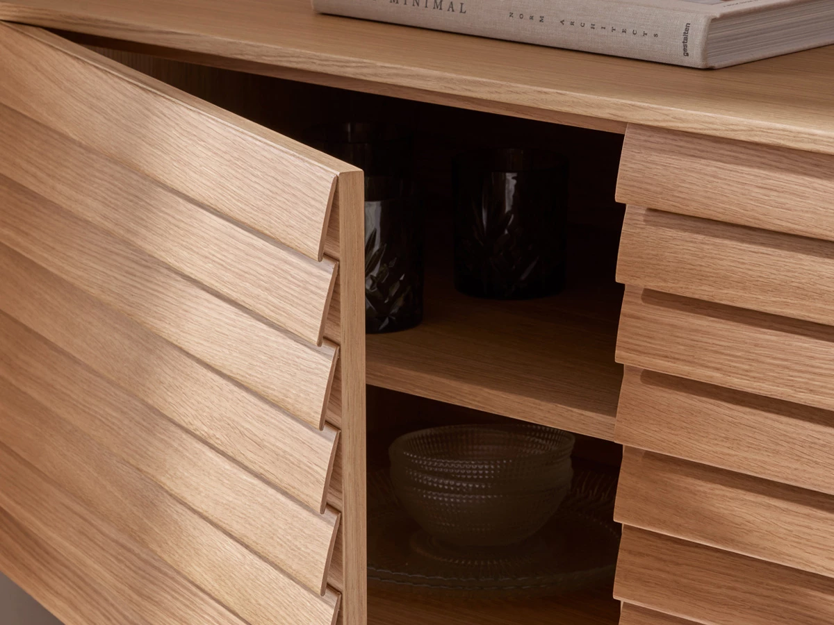 The louvred, overlapping design of the Sussex collection is reminiscent of the shingles on English cottages, whilst still remaining modern and elegant. Integrated into the credenza are two hidden doors, allowing room for storage without compromising the aesthetic of the horizontal lines. Available in either hand-picked walnut or oak veneer, the Sussex Sideboard has a variety of functions: from a media unit to a clever solution to divide a space. Whatever it's purpose, the Sussex is guaranteed to add a quintessential touch of the country to even the most contemporary homes.