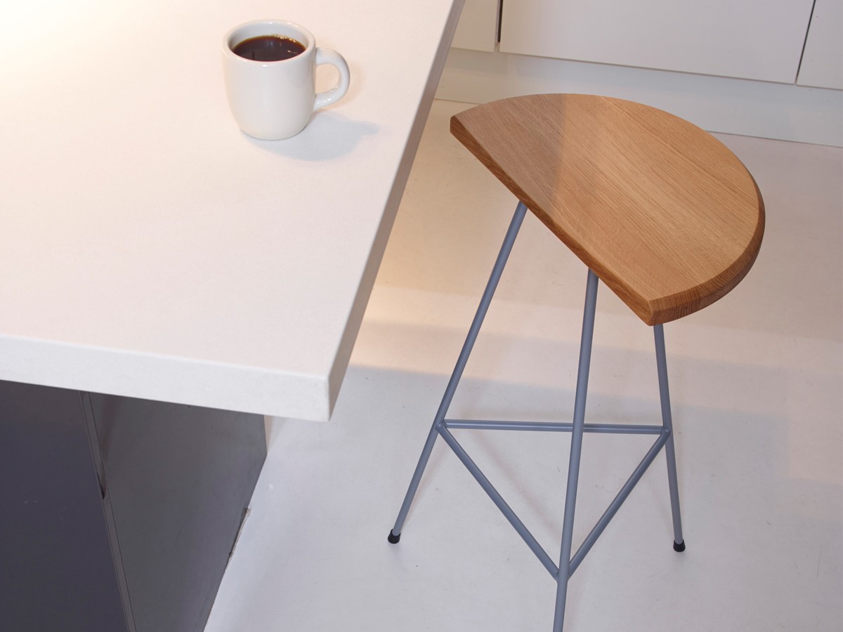 A three-legged bar stool made from solid steel bar with an oak seat. The grey powder-coated tripod configured legs have a low crossbar for foot support and black rubber feet. From above the solid oak seat has a crescent shape, slightly beyond a semi-circle, and features a curved indent for comfort.