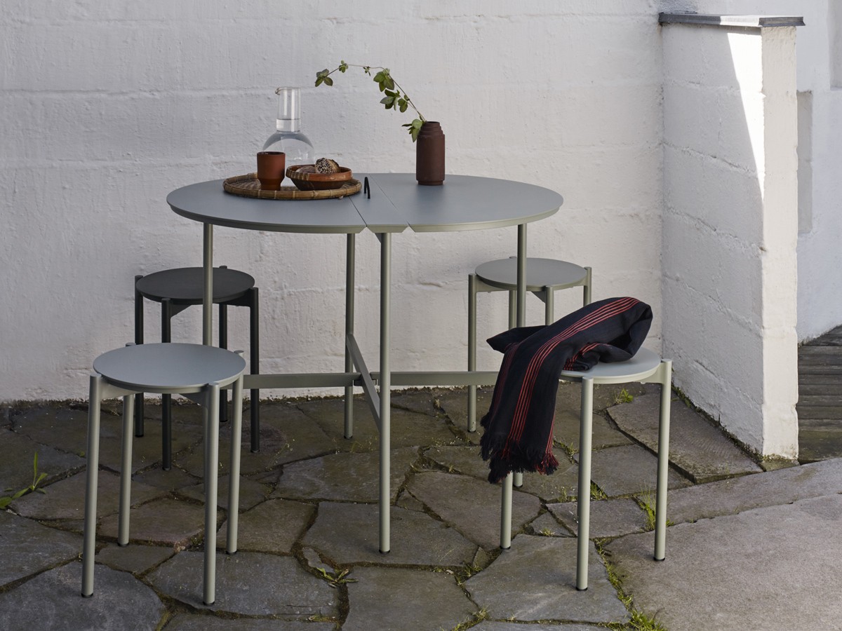 The Picnic Table is light but sturdy, and the design incorporates a small handle on the table top for easy moving. The simple and stackable Picnic Stool is designed for use with the Picnic Table but with a minimal aesthetic, can team easily with other outdoor furniture. The aluminum construction further aids the portability of the design, making it light in weight.