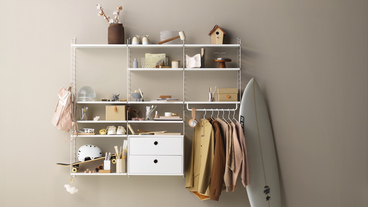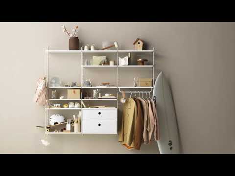 This sophisticated modular shelving system from String reflects both form and functionality. When fully constructed, the system includes shoe shelves, recessed trays, wall panels, flat and tray shelves, as well as customisable hooks and a rod from which clothes can be hung. This is the ideal contemporary storage option for your home.
