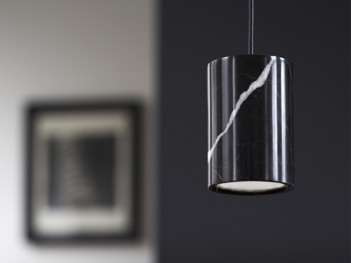 A pure cylindrical form, crafted from solid fine-polished Nero Marquina marble. The rounded inner edge at the shade base is a design signature of the Solid collection.