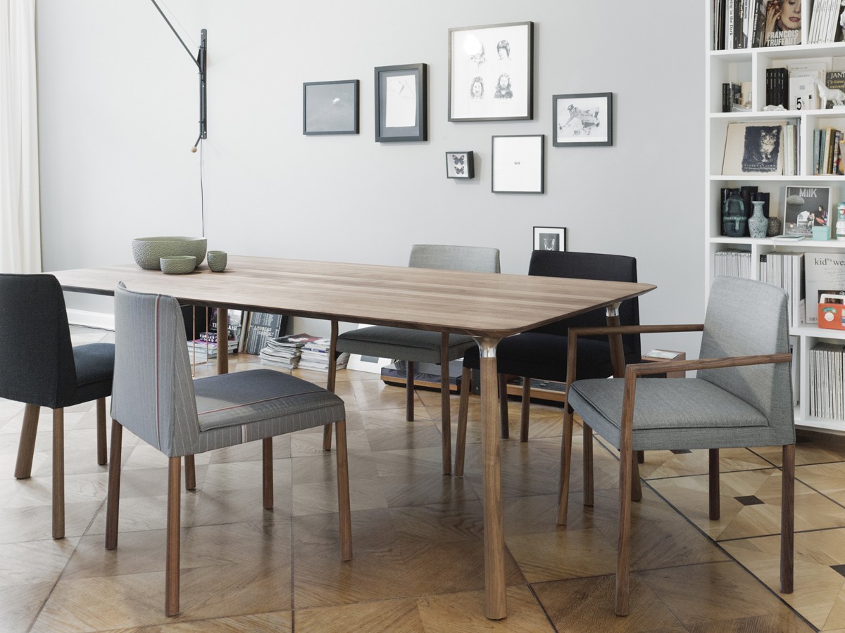 The filigree tabletop forms a flowing transition to the table legs, which open at an angle. The edges of the three-layer solid wood panel are slanted. Cast aluminum head-ends are integrated in the upper end of the individual table legs and create a fascinating contrast. The table can be used in the living and contract segment.