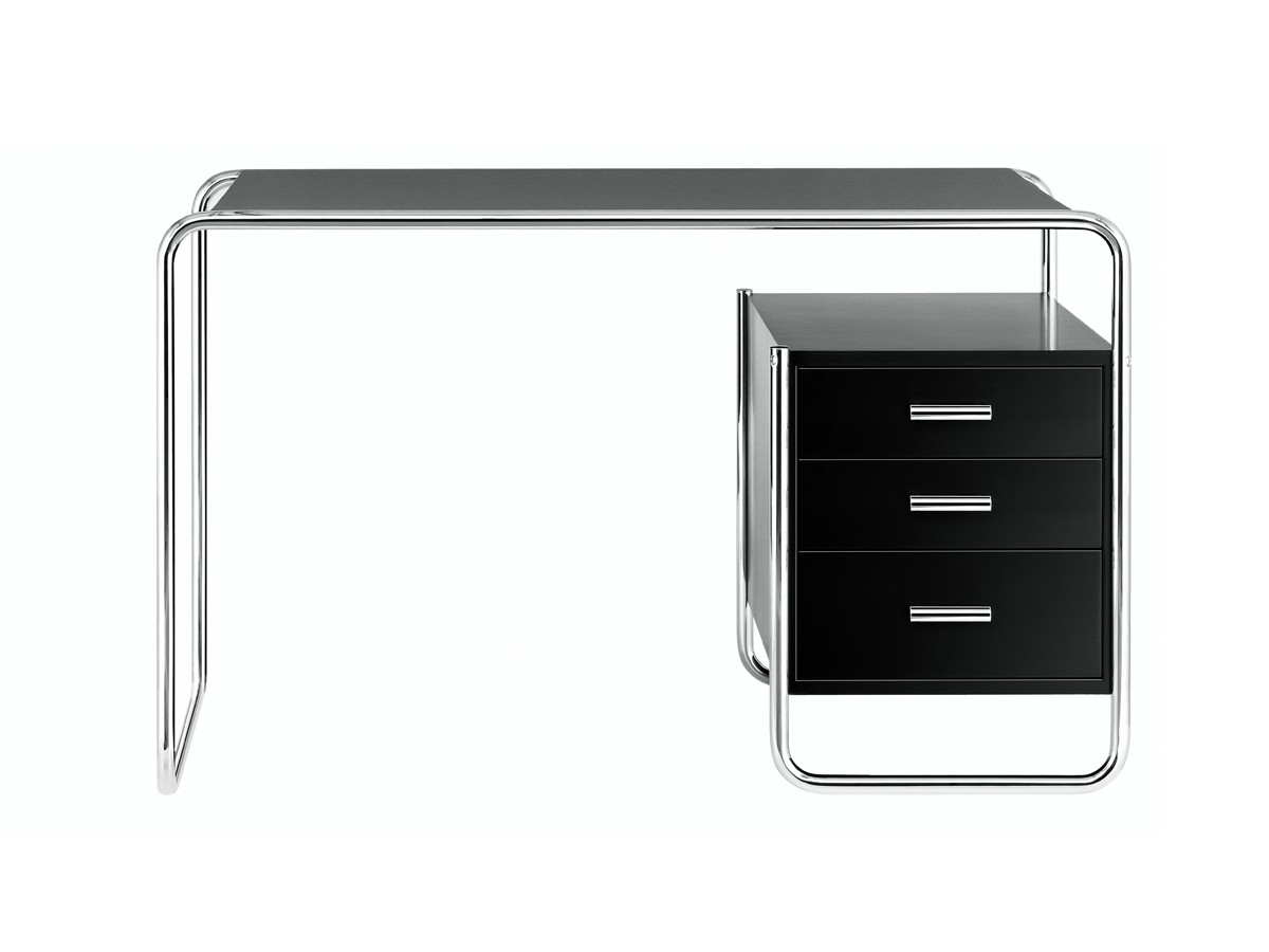 The tabletop and storage elements made of varnished MDF harmonically fit in with the tubular steel design. The supporting frame consists of a single line; the wooden elements seem to float in it. The simple piece of furniture, which is formally balanced in its proportions, represents an expressive piece of contemporary history known as "The New Objectivity."
