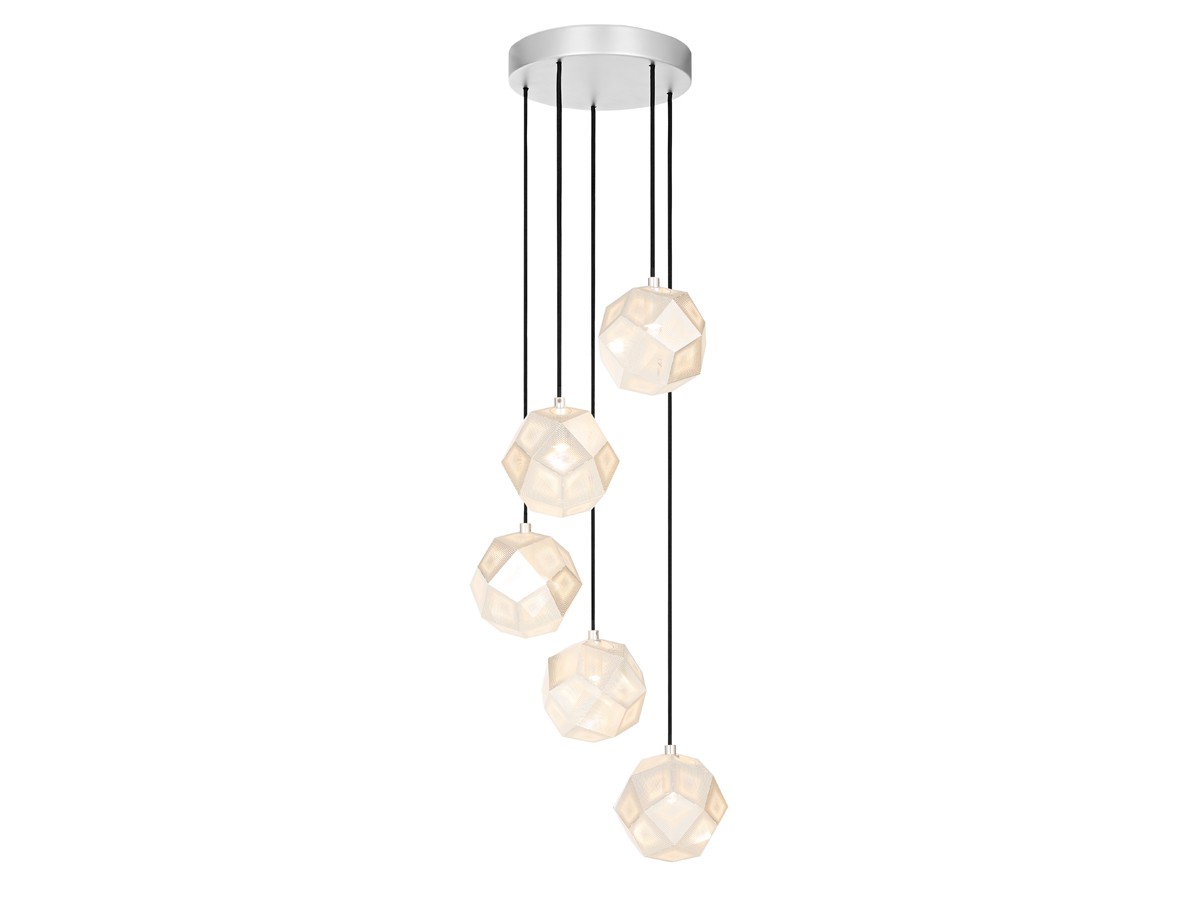 Etch is a series of etched pendants inspired by the logic of pure geometry. Etch generates a mass of complex linear shapes when lit. Created using an industrial process, its surfaces are formed from sheets of acid‑etched metal that is photo‑etched, then dipped in acid to dissolve the unexposed parts.