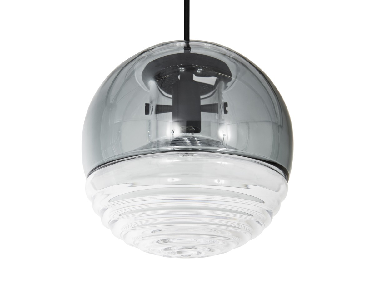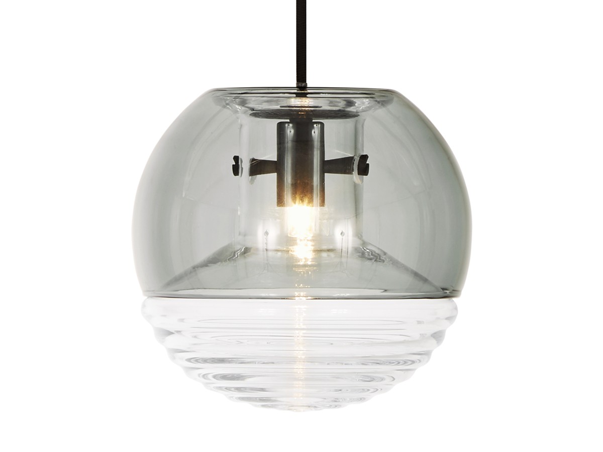 The ridged and rounded Flask base refracts the light giving a warm, rippled and comforting glow, while the smoked-glass hood covers the lamp fitting reducing glare.