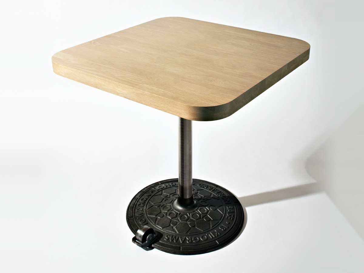 A hard working table specifically constructed to ease the workers' burden. The rolling wheel on the cast iron base enables lone waiting staff to reconfigure tables with minimal fuss and assistance.