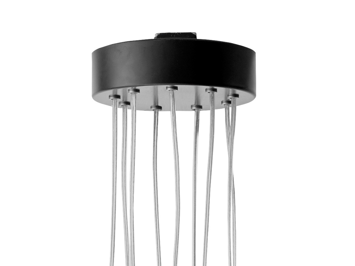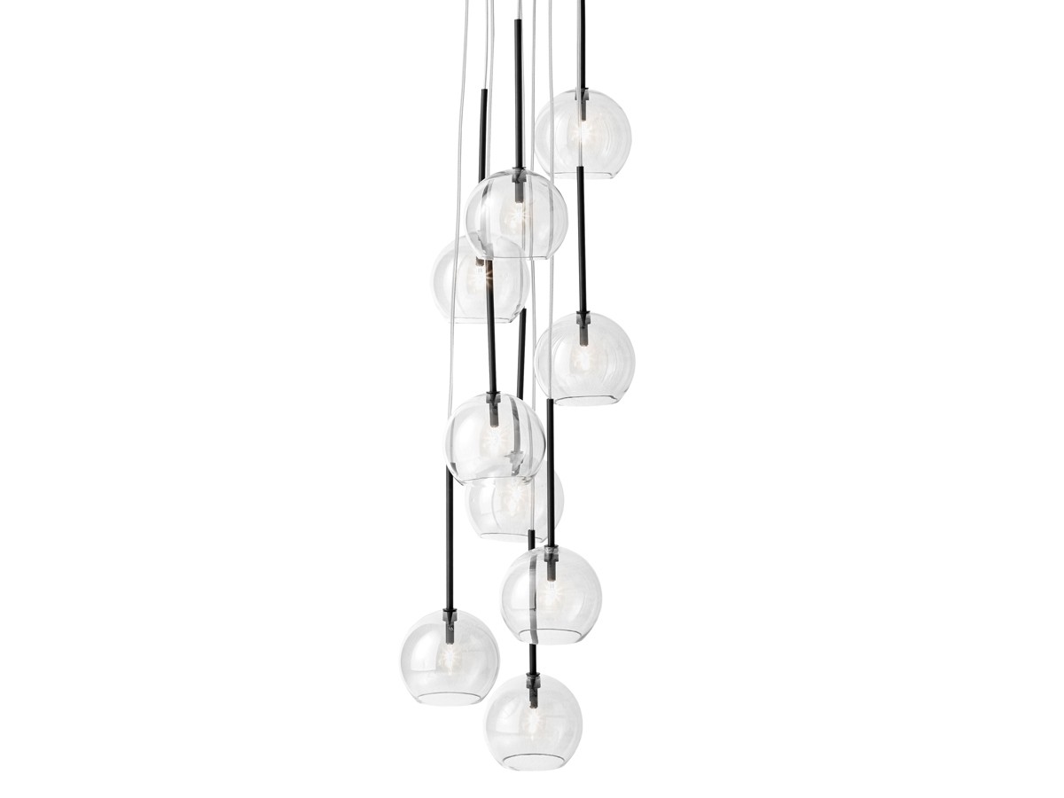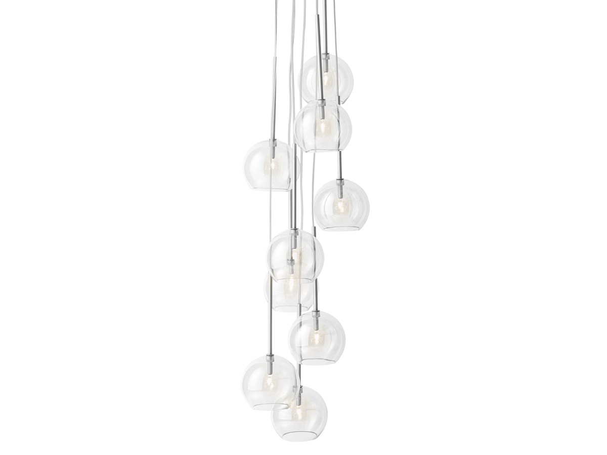 The armature consists of a circular ceiling plate from which a cascade of nine pendants can be hung to offer a more dramatic lighting spectacle. The halogen light sources emit a soft, ambient light. They are encased by hand-blown glass globes, each of which is unique in its character; evidence of the craftsman’s intervention in the manufacturing process.