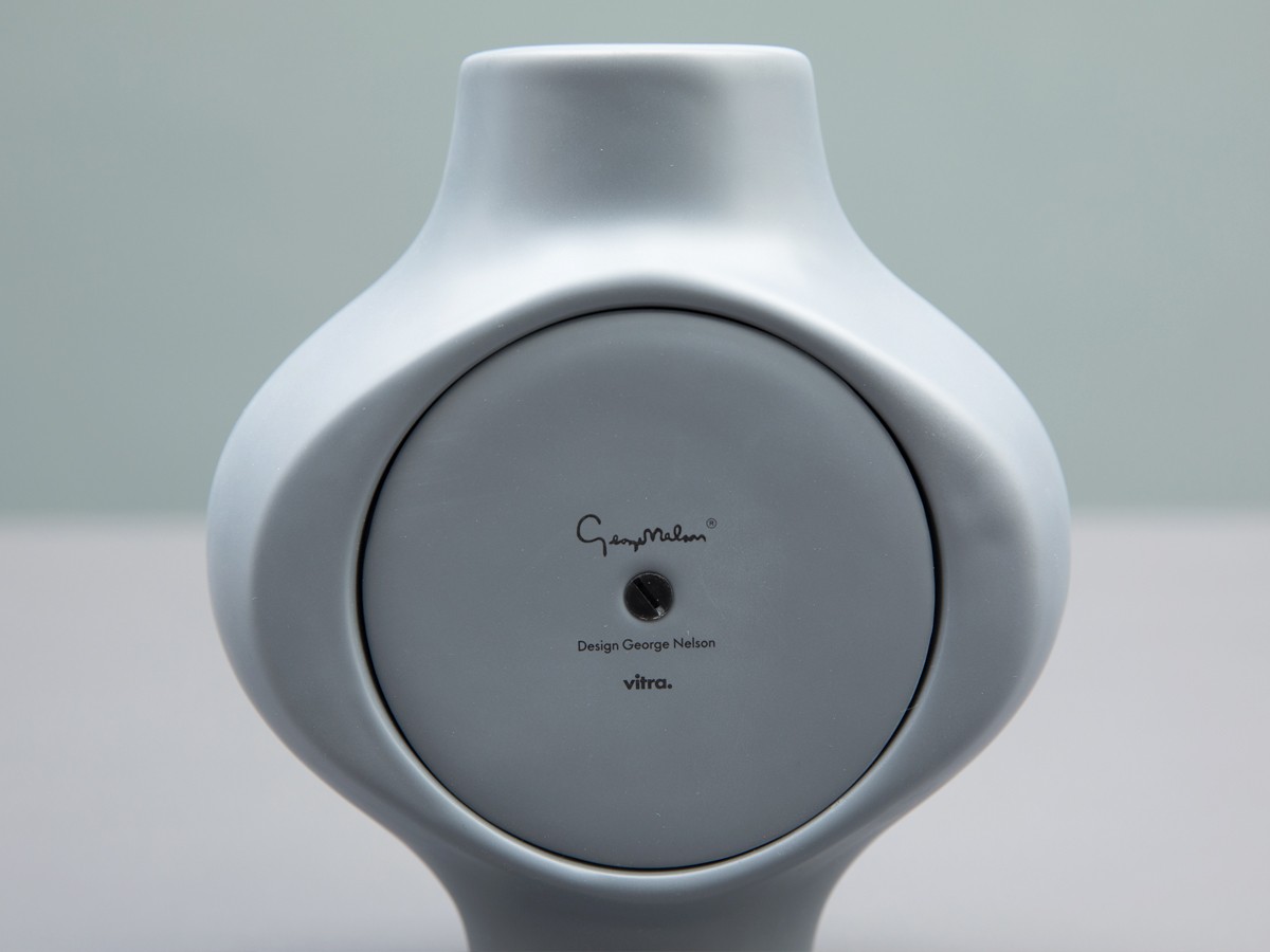 Evocative of classic mid-century retro design, the Vitra Ceramic Clock Model 3 version comes in a charming grey and light blue finish with the clock face stretched horizontally, tapering the top and bottom of the clock. The clock is the perfect timepiece for desks, side tables and mantlepieces.