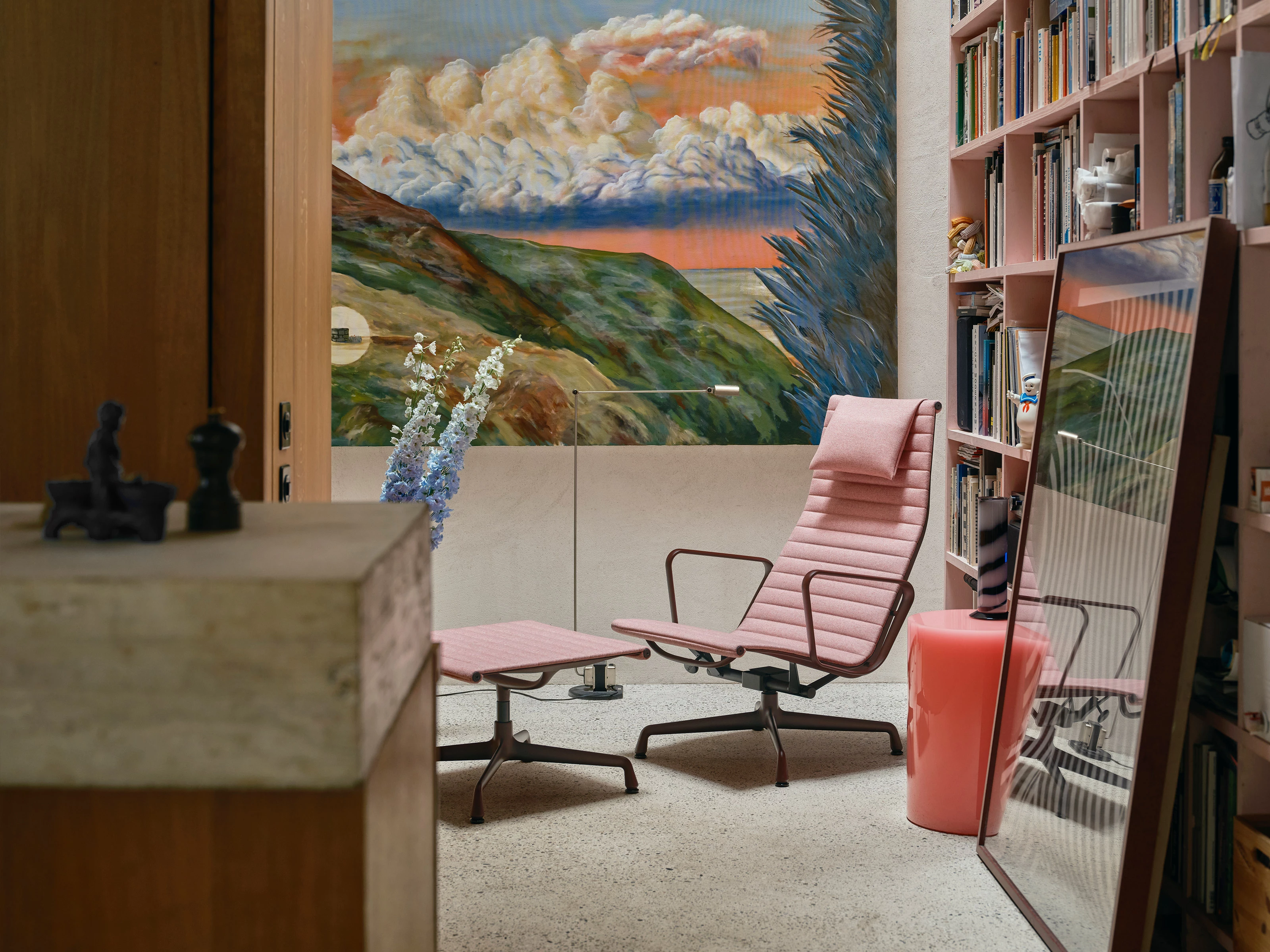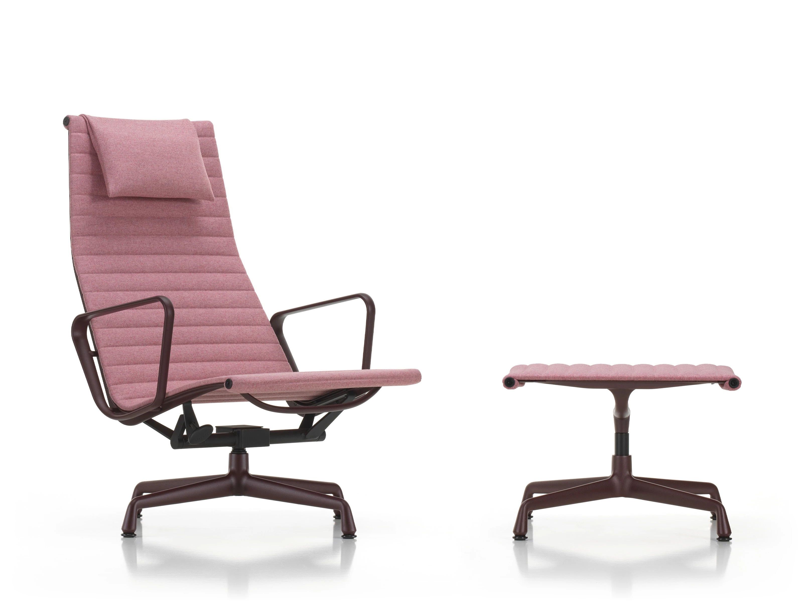 With its high backrest, supportive head cushion and tilt mechanism that intuitively adjusts to your weight, the swivel-mounted chair provides tailored support ideal for lounging. Adapting to fit the body snugly and delivering superior comfort, the EA 124 Chair is upholstered in a choice of premium fabrics and accompanied by a matching ottoman, the EA 125, which finishes the form-driven aesthetic perfectly.