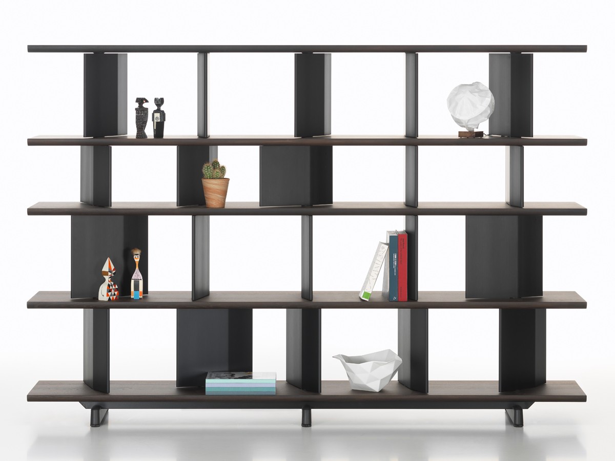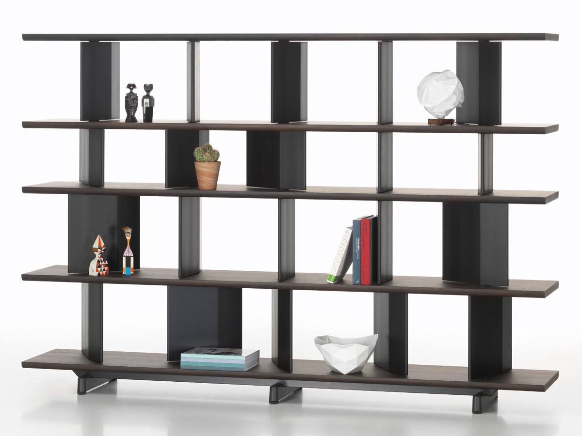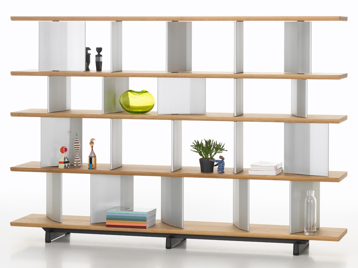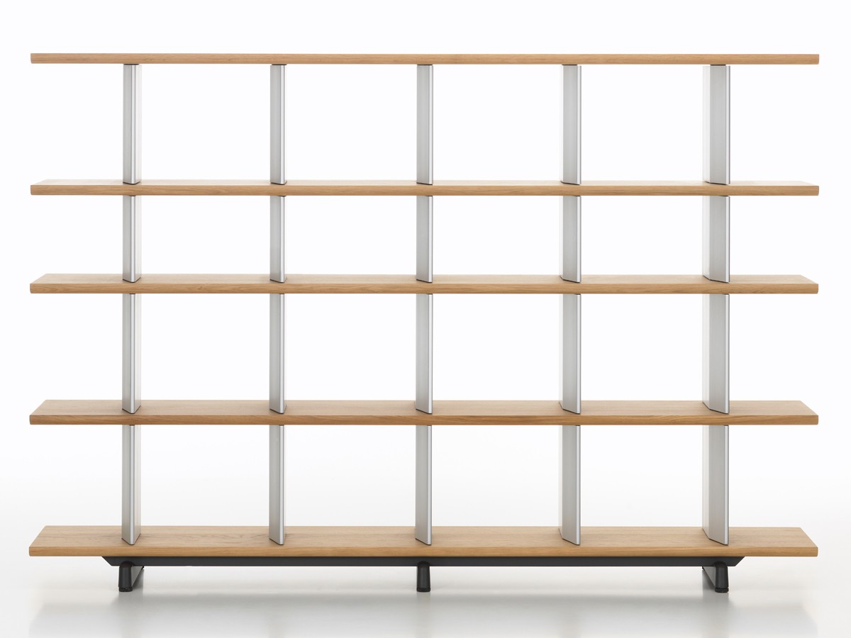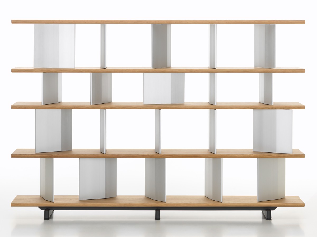 The vertical aluminium panels are Planophore's most striking structural feature: they can be rotated to serve as functional shelf dividers. When the slightly asymmetrical dividers are positioned parallel to the shelves, Planophore becomes a partition element; set perpendicularly, the panels divide the shelves into varying compartments that can accommodate books and similar objects; if just a few individual panels are turned in a parallel direction, they provide an attractive background for decorative objects.