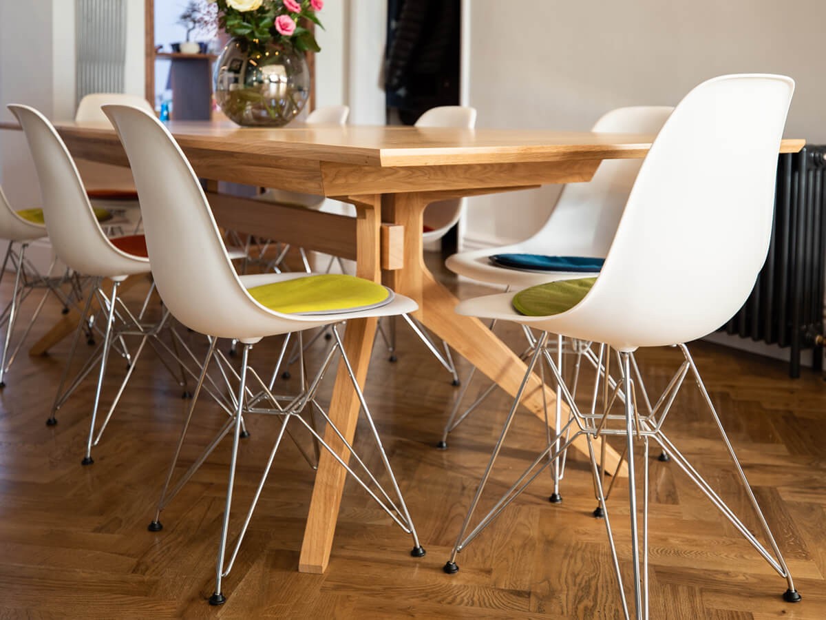 The different coloured sides create subtle or bold accents, which are further enhanced by the edge binding. Designer Hella Jongerius developed the Seat Dots as universal seat cushions, whose size and colour palette perfectly suit a diverse range of chairs. The cushion can be used on both sides and washed if necessary.