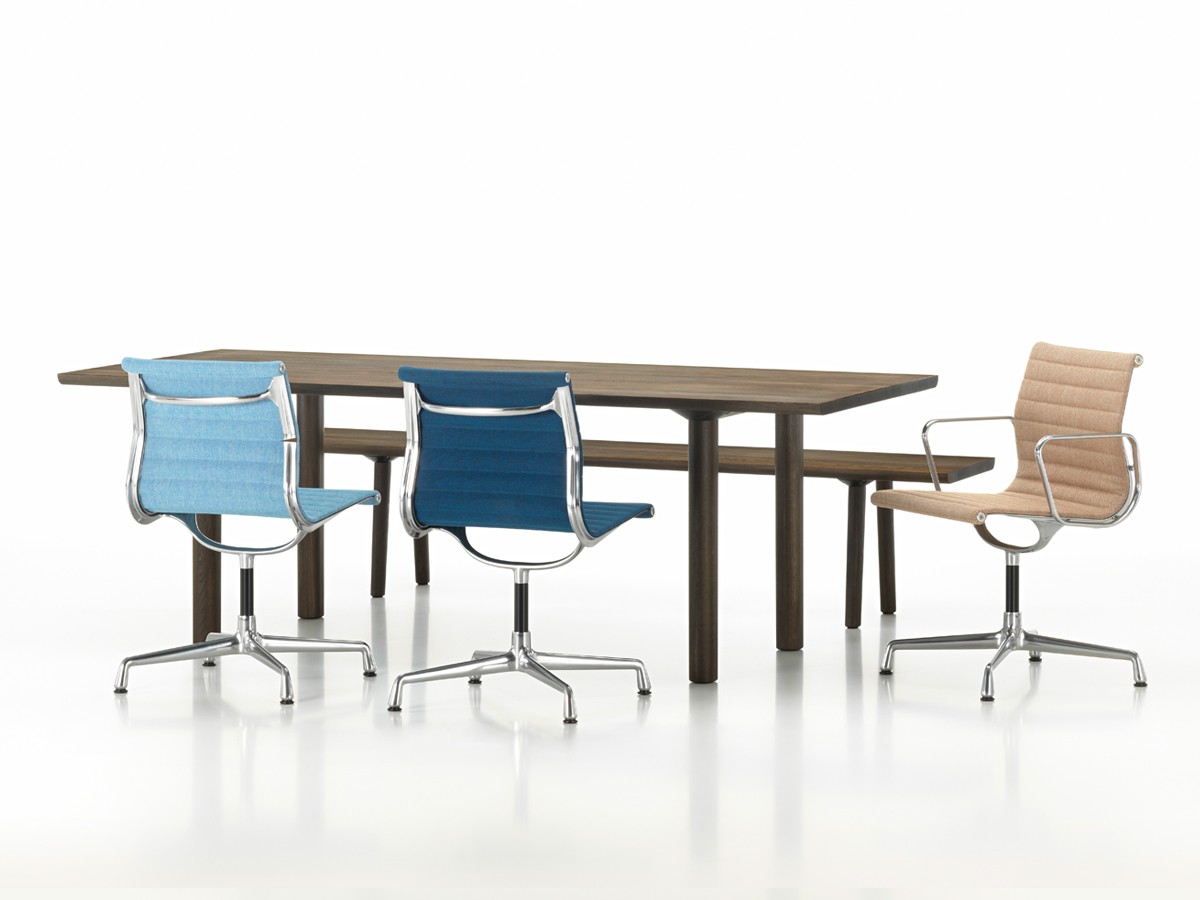 Its legs, made of solid wood with an oval profile, are horizontally connected by strong aluminium bridges that ensure the table’s stability and prevent the frameless solid wood top from warping. The rounded edges on the bottom of the table top are not just a gesture of added comfort. Depending on the viewing angle, they give the table top an especially slender appearance, thus emphasising the elegance of the overall design.