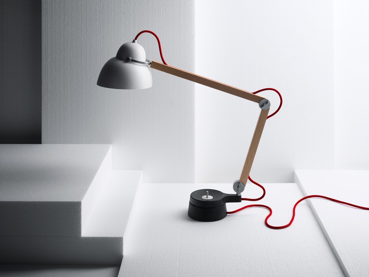 Ilse Crawford chose honest materials that carry clear messages: iron for its feelings of stability, reliability, trust; wood with its warmth and life, and mineral plastic for its intimate glow, as well as its tactility. When put together three three materials create a certain oddness. This is because there is an innate awkwardness in the directional light that they wanted to amplify. Dimmable table lamp. Slightly transparent shade hides the light source for glare protection. Two joints, an adjustable head and a rotation mechanism in the base. Electronic components integrated.