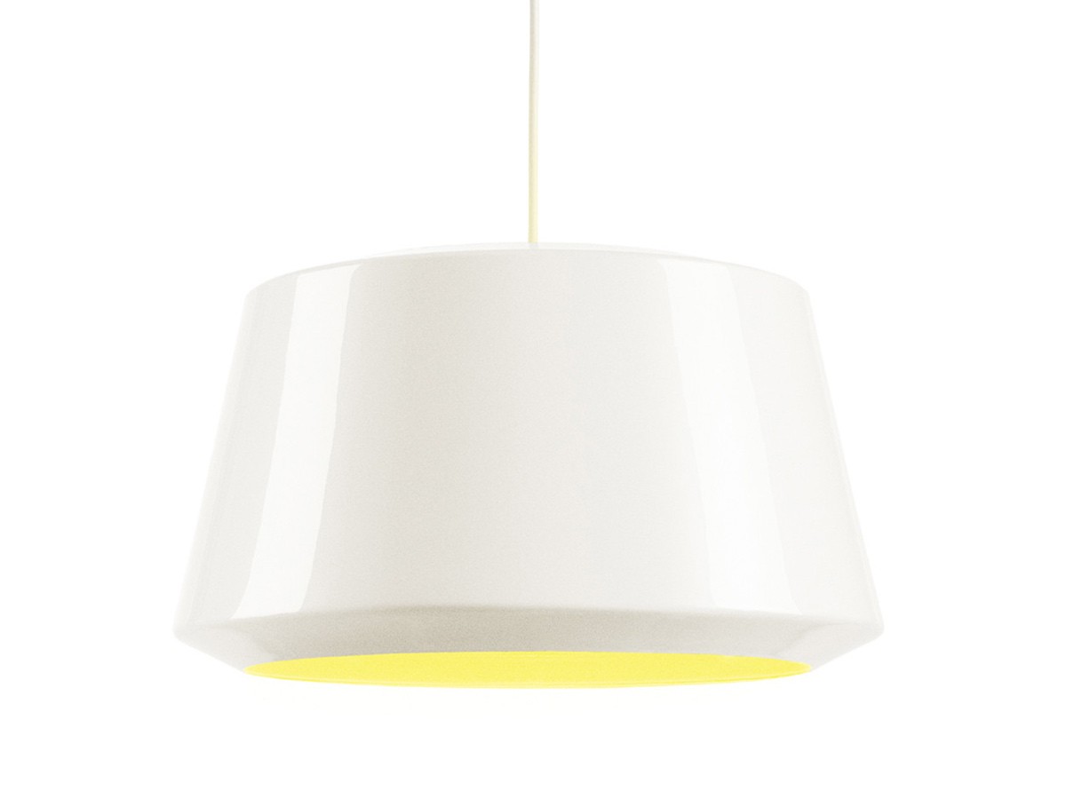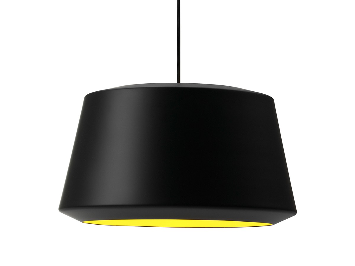 The Can Pendant Light has either a black or white painted exterior, with a contrasting yellow interior. Its simplistic 'domed' shape makes it suitable for a number of settings, from above a dining table to inside an entrance way.