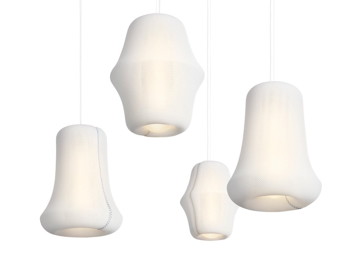 'Loom' is a collection of organic textile pendant lamps utilising a new 3D woven polyester material - originally used as a source of comfort in the bedding industry, and never used before in the lighting industry. The textile can be stretched around complex forms and diffuses the light through a dense network of warp woven polyester fibres.